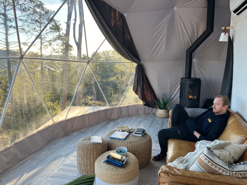 We arrived around 5:30 in the evening and immediately hopped into our own, private outdoor hot tub located right beside the dome! The sun was setting and there was a cool breeze blowing, but the hot tub was primed and quickly warmed us up. There was also an gas fireplace beside the hot tub, which Justin turned on for us to give an even cozier vibe. We stayed out for a couple hours as the stars began to appear and just talked about life and how wildly lucky we are to be in a place like this.