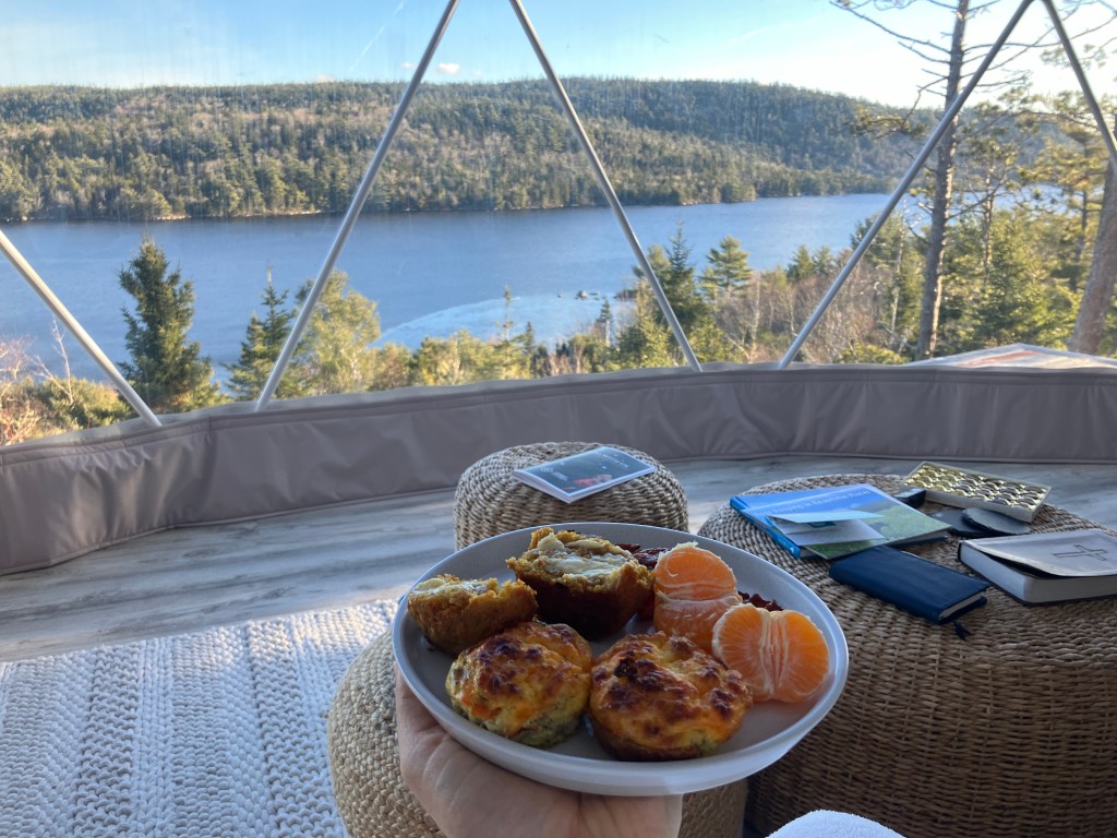 Our morning was spent on this couch, looking out at the lake. For our brunch, I brought some carrot muffins, egg bites, bacon and fruit. It was super yummy!