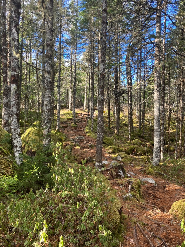 We didn’t want to take the car down to the parking lot and thought maybe we could get to the trail head from our dome. We headed down through the bush and quickly regretted our decision as we got stuck and poked by the bush and moss. We finally pushed through and found ourselves on the trail, but were pretty embarrassed when looking behind us and seeing a couple coming up the way. They probably were questioning what in the world we were doing way deep in the bush!