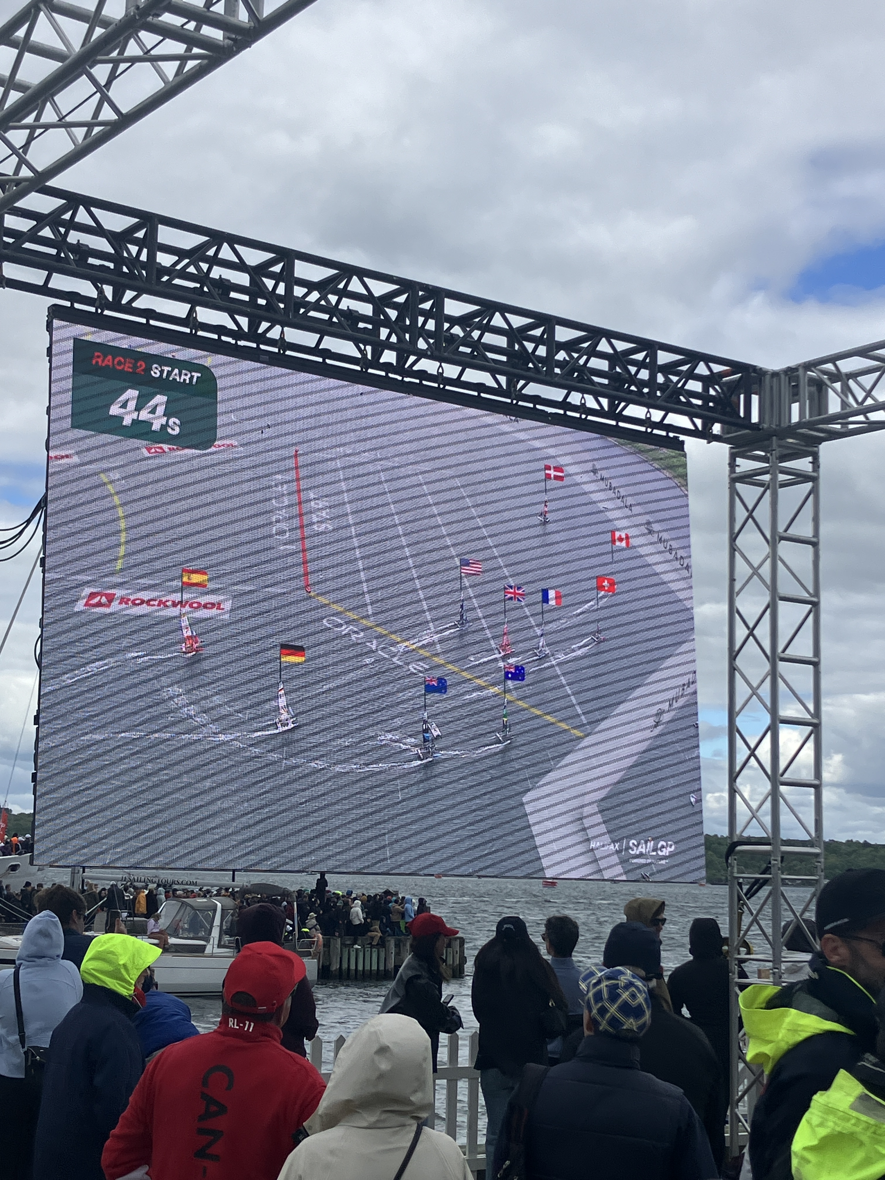 The rain lifted and we got in line to enter the ticketed area. Once we had scanned our tickets, we were in a closed off section of the boardwalk – similar to an F1 paddock. There were no stands to sit and watch. Instead, you had to gather, shoulder-to-shoulder, around the edges of the docks to catch a glimpse of the boats as they passed by. Luckily, they had monitors showing the live broadcast with commentary explaining how the racing worked. Otherwise, we would not have had a clue as to what we were watching.